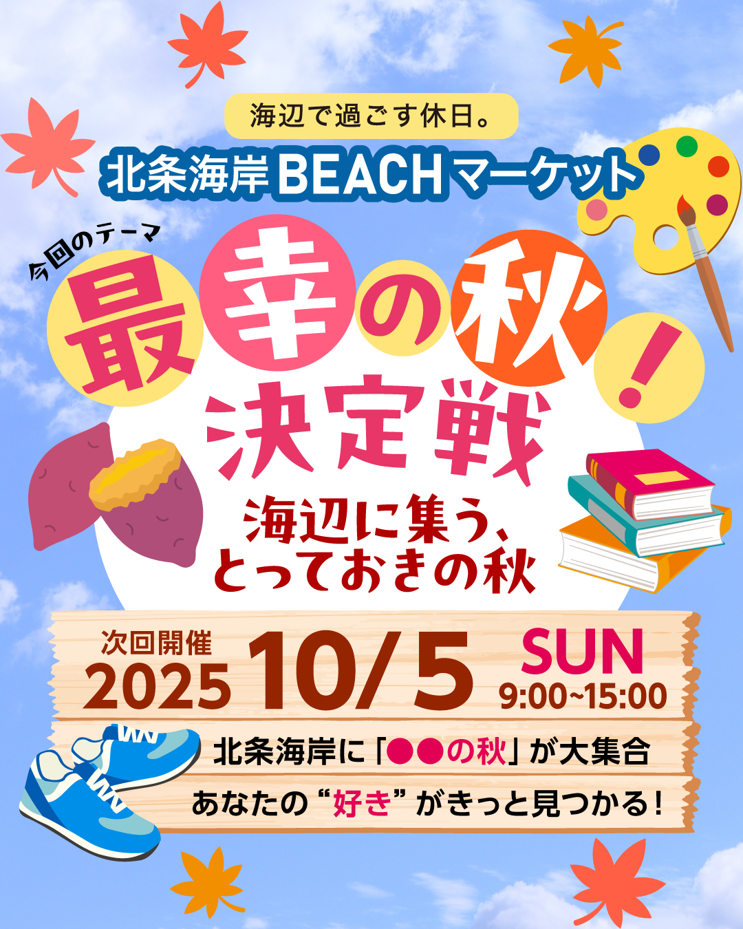10月、11月は通常の9〜15時のイベントに戻ります♪ 今回のテーマは、『最幸の秋!決定戦』〜海辺に集う、とっておきの秋〜 秋といえば食欲の秋、芸術の秋、スポーツの秋、読書の秋・・・とたくさんの楽しみ方がありますよね。そ … 続きを読む 10月5日は「最幸の秋!決定戦」です!